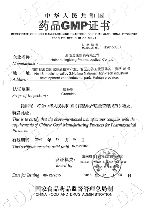 2015年12月,根据国家食品药品监督管理局《关于印发药品生产质量管理规范认证管理办法的通知》(国食药监安[2011]365号)和海南省食品药品监督管理局《关于印发海南省药品生产质量管理规范认证实施办法的通知》(琼食药监安〔2011〕54号)的规定,经现场检查和审核,海南灵康制药有限公司固体车间顺利通过GMP认证,符合《药品生产质量管理规范(2010年修订)》。