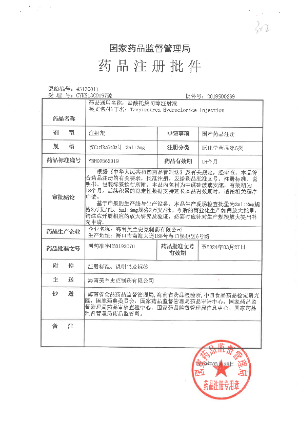 海南美兰史克制药有限公司喜获盐酸托烷司琼注射液药品生产批件