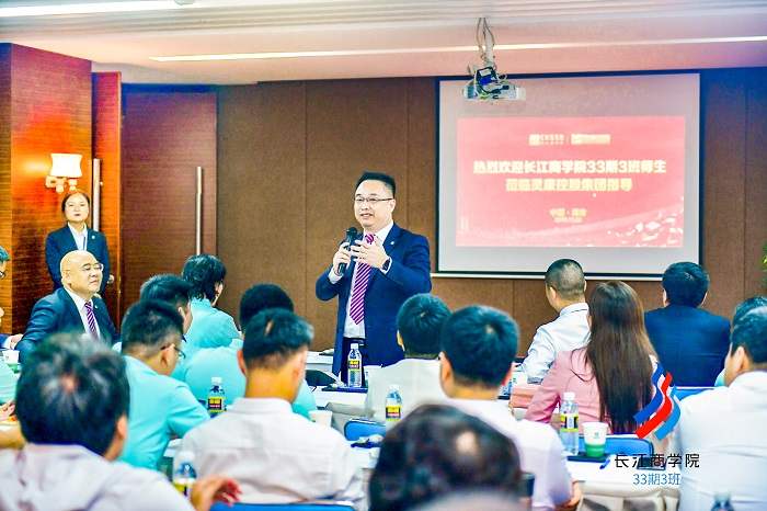 灵康药业集团董事、常务副总经理胡建荣代表集团董事长陶灵萍和全体员工对大家的到来表示热烈的欢迎。董事长作为灵康集团的创始人,是长江商学院 EMBA19 期校友。他指出,长江商学院拥有贯通中西、享誉全球的教授团队、汇聚广泛影响力的商界校友网络,致力于培养中国新一代的“具有全球视野与全球资源整合能力、人文关怀与社会担当以及创新精神的商业领袖”,对于身处转型变革的中国企业来说,这是一个优质的平台。感谢此次活动走进灵康、了解灵康,我们将继续以开放包容的姿态,与各位企业家交流共享,积极探讨、共创共赢!
