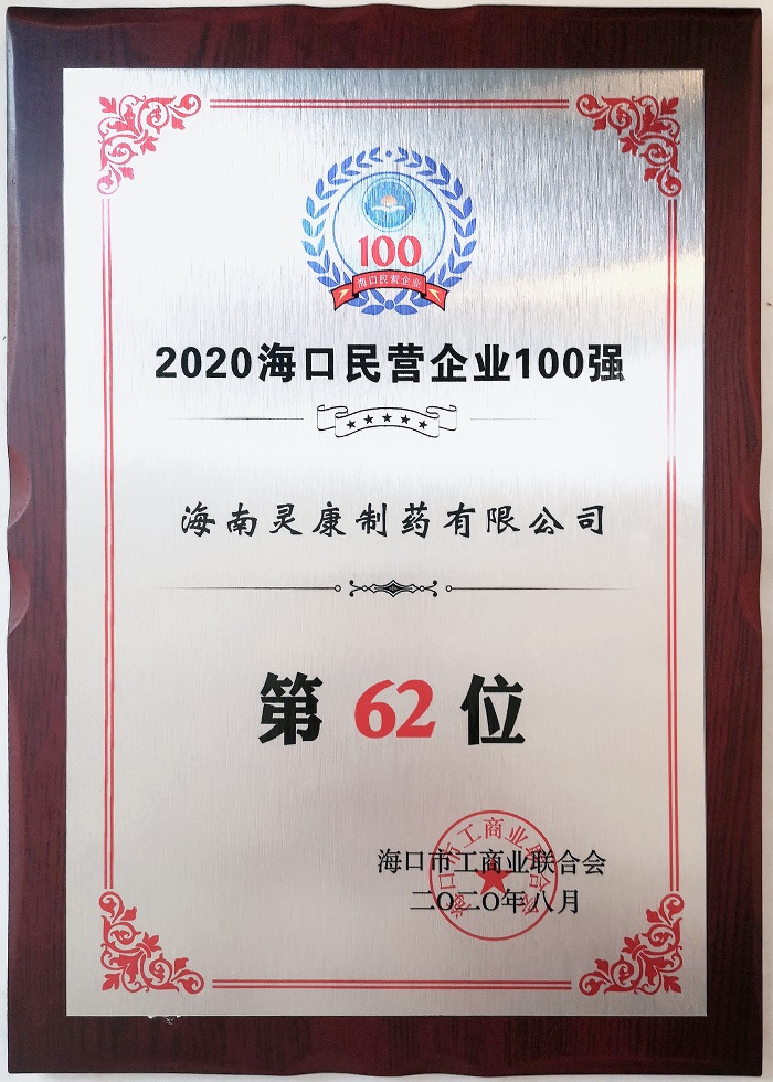 海南灵康制药有限公司荣获“2020年海口市民营企业100强”称号