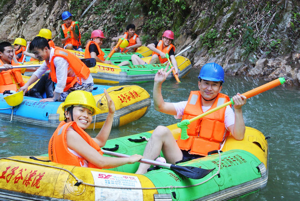 第二天上午,我们坐车前往另一著名景点——森林氧吧。氧吧以森林、清泉、山石、溪涧、瀑布为基点,以高含量的对人体健康极为有益的森林空气负氧离子和植物精气等生态因子为特色,辅以各类简约、朴素且与环境格调相一致的游憩设施。在这里可漫步砾石浅滩,过独木险桥,摆秋千吊床,观千叠瀑布, 闻森林馨香,吸高氧空气,听鸟鸣泉音,感受一份山野的灵气,体会一股发自内心深处的宁静与祥和。途中,有人驻足拍照留念,有人缓步聆听自然的耳语, 还有些人爬完一次再爬一次,完全沉浸在登山的乐趣中。山内有呈垂直状的天梯,抬头仰望,直冲云霄, 向上爬的时候只有看着脚下才能一阶阶拾级而上。下午,我们共同抵达王子谷进行漂流。整个景区内处处山随水转,绿树成荫,蜂蝶相戏。从漂流起点出发, 穿越时光隧道的浪漫惬意,36米落差的飞瀑急流,时而跌宕起伏,时而平缓如砥……大家泛舟嬉戏,时而奋力前行,时而驻足戏水,都沐浴在清新、自然的山水之间!